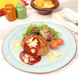 <7>に<8>を盛りつけ、ポテトチップス(分量外)をお好みの大きさに砕いてのせる。ベビーリーフとミニトマトを添える。
