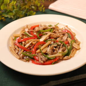 しっかりと焼き色がついたら玉ねぎを加えて炒め合わせる。しんなりしたらたけのこ、ピーマン、パプリカを炒め合わせる。