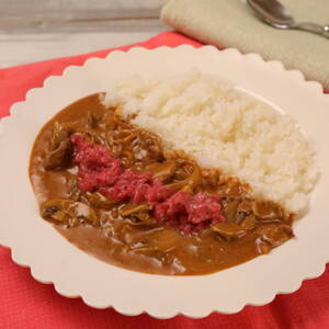 器にごはん、<6>のハヤシライスを盛り付け<3>のいちごソースをかける。