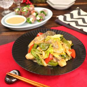 キャベツを入れて炒め、パプリカ、ピーマン、長ねぎも順に入れて炒め合わせる。全体に焼き色がついたら火を少し弱める。