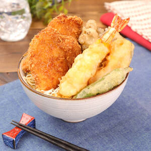 <13>をご飯の上に盛りつけ、【天つゆ】をかける。<15>を【かつソース】にしっかりと浸し、キャベツの上に盛りつける。