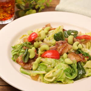 キャベツを加えてさっと混ぜ合わせる。器に盛り付けて枝豆スナックを散らす。
