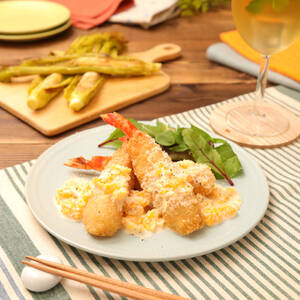 ボウルに【A】を入れて混ぜ合わせる。<3>に薄力粉(分量外)をまぶし、尾の部分を持ちながら【A】にくぐらせる。