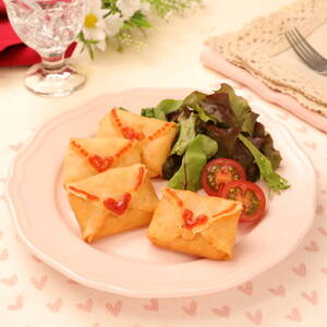油がおちついたらケチャップで綴じ目にハートを書き、器に盛りつける。ベビーリーフやミニトマトなどお好みの野菜を添える。