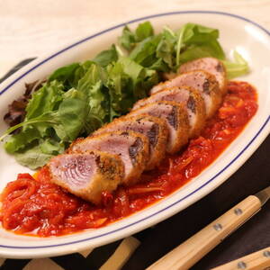 器に<3>を敷き、食べやすい大きさに切った<5>を並べる。お好みで黒こしょうをかける。
