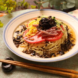 器に麺を盛り、<2>をかける。トマトを並べ、錦糸卵、きゅうり、ハムを盛り付ける。輪切りのオリーブを乗せる。
