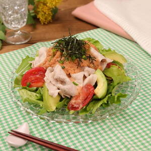 器にグリーンリーフと水菜を敷き、トマト、アボカド、豚しゃぶを盛りつける。