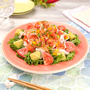 器にサニーレタス、かいわれ大根、<6>を盛りつける。アボカド、トッピング用のトマトを飾り<4>をかける。