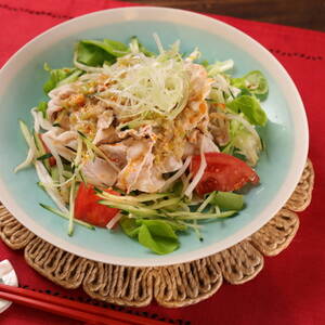 豚肉を盛り付けて<3>をかける。水気を切った白髪ねぎを添える。お好みでラー油をかける。