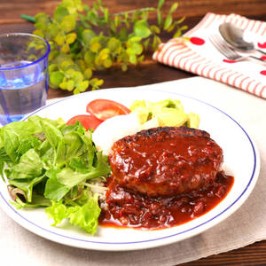 ハンバーグを盛り付け、チェリーデミをかけ、温泉卵をのせる。