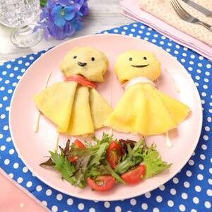 器にマヨネーズで雨を書く。<10>と<15>をそれぞれ4等分に分ける。<5>で包み、てるてる坊主の形にして器に並べる。