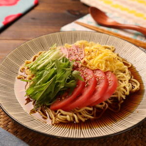 器に麺を盛り、<2>をまわしかける。トマト、水菜、錦糸卵、ハムを盛り付け白ごまを散らす。