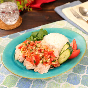 ボウルにごはんを入れて<9>、鶏肉の蒸茹で汁を入れて混ぜ合わせる。お好みで塩(分量外)で味を調え、器に盛りつける。