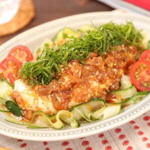 器にきゅうり、ミニトマト、<6>、大葉を盛りつける。<8>、お好みでラー油をまわしかける。