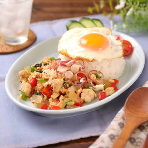 お皿にごはんを盛り付けて<6>をかけ、<7>を乗せ、残りのみょうがを散らす。お好みできゅうりやミニトマトを添える。
