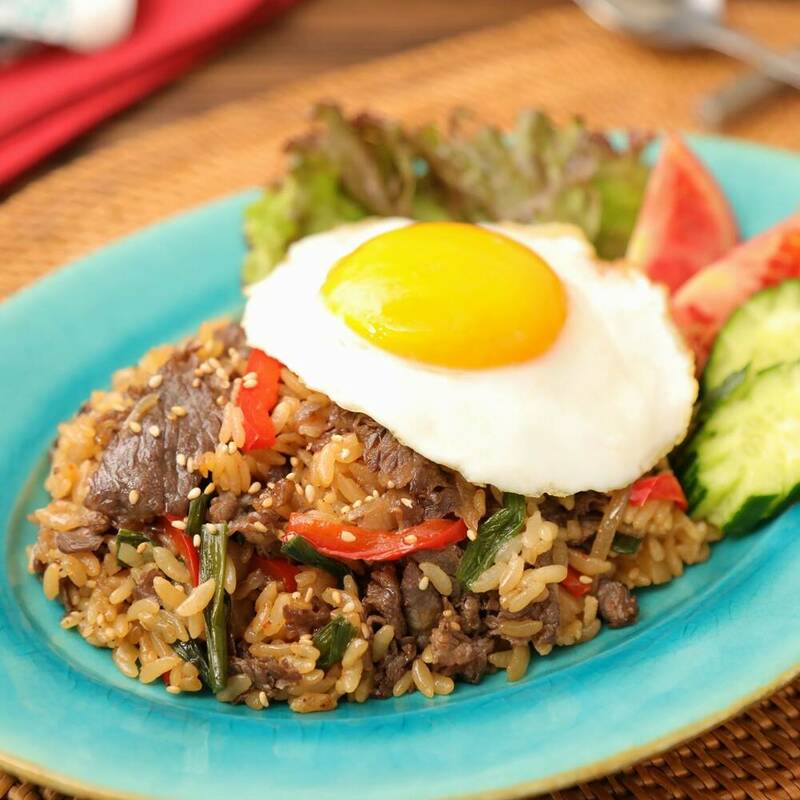 牛肉に火が入ったら、にらを入れて全体を混ぜ合わせ、フライパンの端によせる。空いたところに<1>のごはんを入れて広げる。