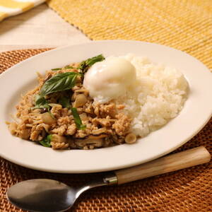 器にごはん、<6>を盛り付けて温泉卵、飾りのバジルを添える。