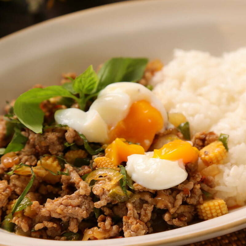 器にご飯、<6>を盛り付ける。温泉卵を乗せて飾り用のバジルを添える。