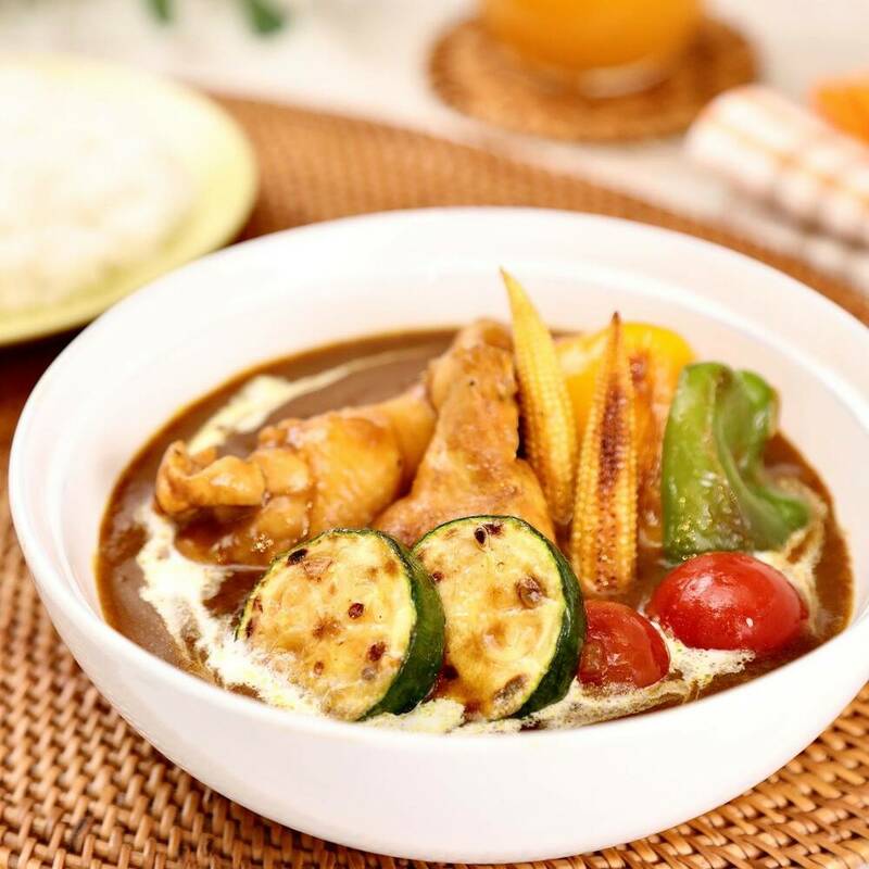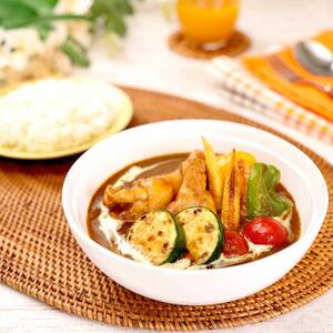 器に<6>を盛りつけ<9>をトッピングする。お好みで生クリームをまわしかける。別の器にごはんを盛りつけて添える。