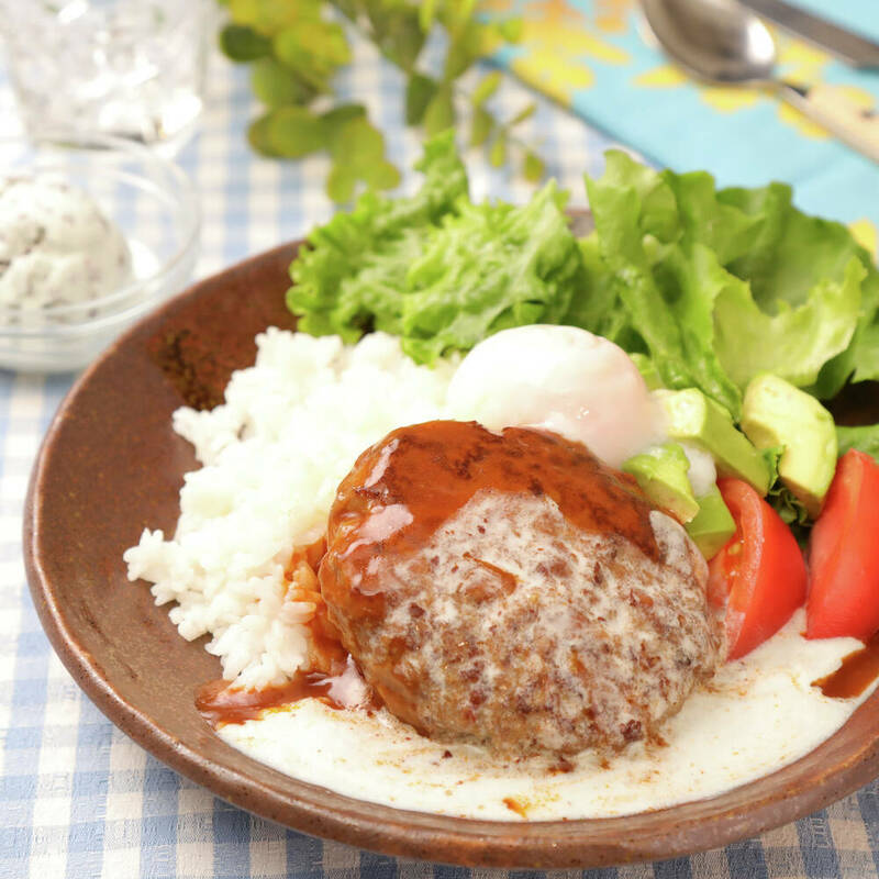 ハンバーグを盛り付け、<9>をかけ、温泉卵をのせる。<10>を添える。