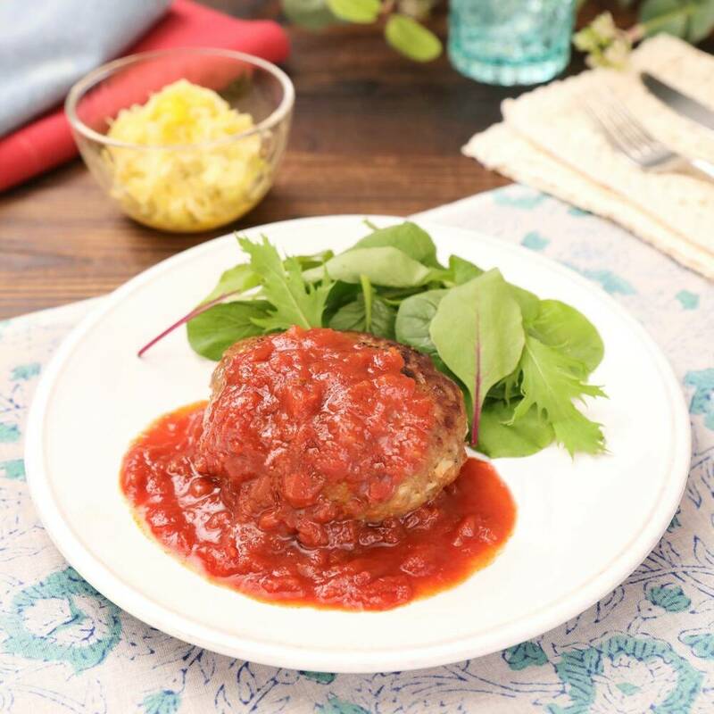 【トマトソース】ハンバーグを焼いたフライパンに【A】を入れて中火で熱し、トマトの果肉をつぶすように炒める。