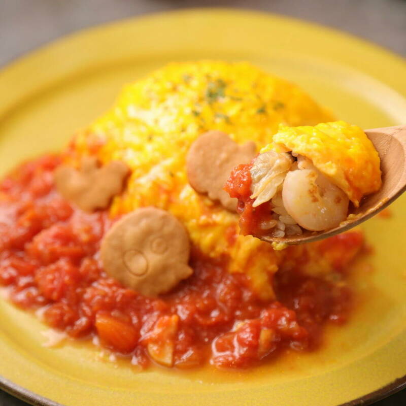 【A】の半量を流しスクランブル状になるまで加熱する。<11>の上にスライドさせてのせる。
