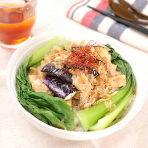 器にごはんを盛り、<6>を4〜5切れずつのせ<9>、<4>を盛り付ける。かつおぶしをかけ、糸唐辛子を飾る。