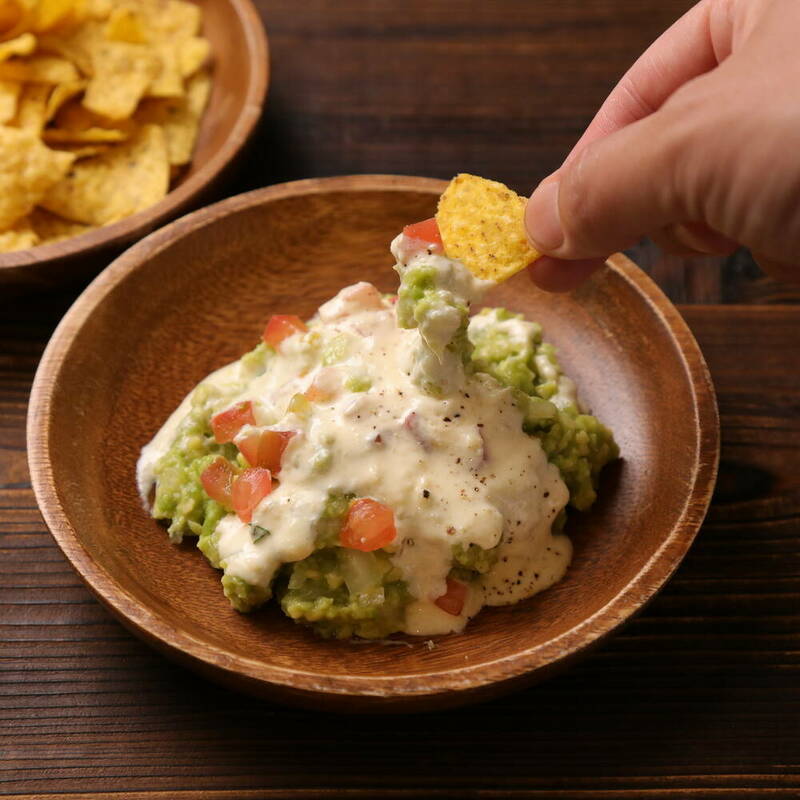 器に<2>を盛り付け、トマトを散らし<3>をかける。お好みで粗びき黒こしょうをふり、トルティーアチップスを添える。