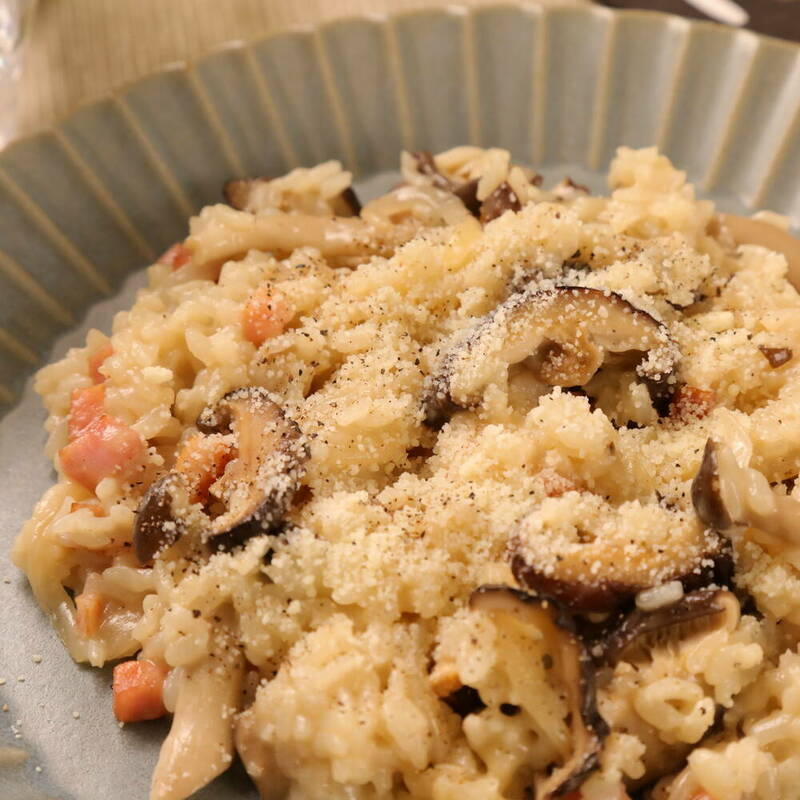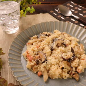 しんなりしたら白ワインを加えてアルコールを飛ばす。ごはん、出汁、コンソメを加えて中火で混ぜながら煮る。