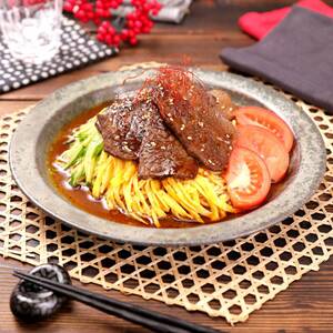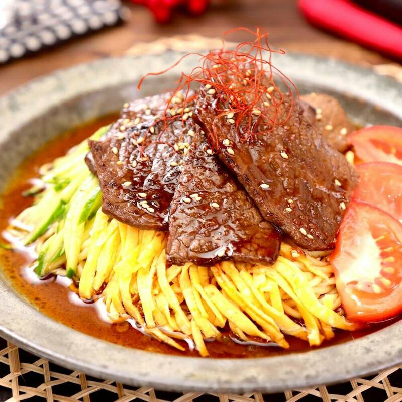 きゅうり、トマト、錦糸卵をのせ、冷やした【A】をまわしかける。<7>を盛りつけ、お好みで煮詰めたたれをかける。