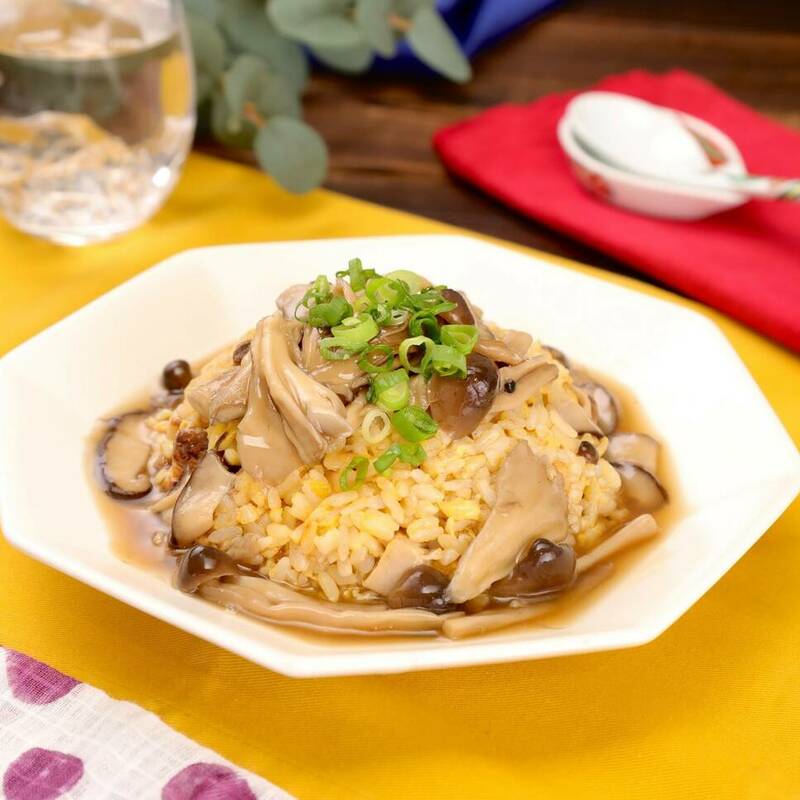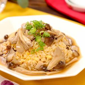 【きのこあんかけ】まいたけ、しめじは石づきをとり、手でほぐす。しいたけは軸の硬い部分を切り取り、全て薄切りにする。