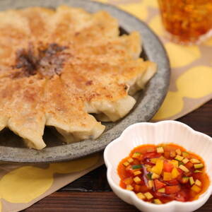 フライパンにサラダ油を熱し、ひだを上にして餃子を並べ、焼き色をつける。【C】を混ぜ合わせておく。