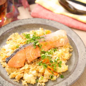 器に<9>を盛り付け、<7>の鮭をのせ、小口切りにした青ねぎを散らす。