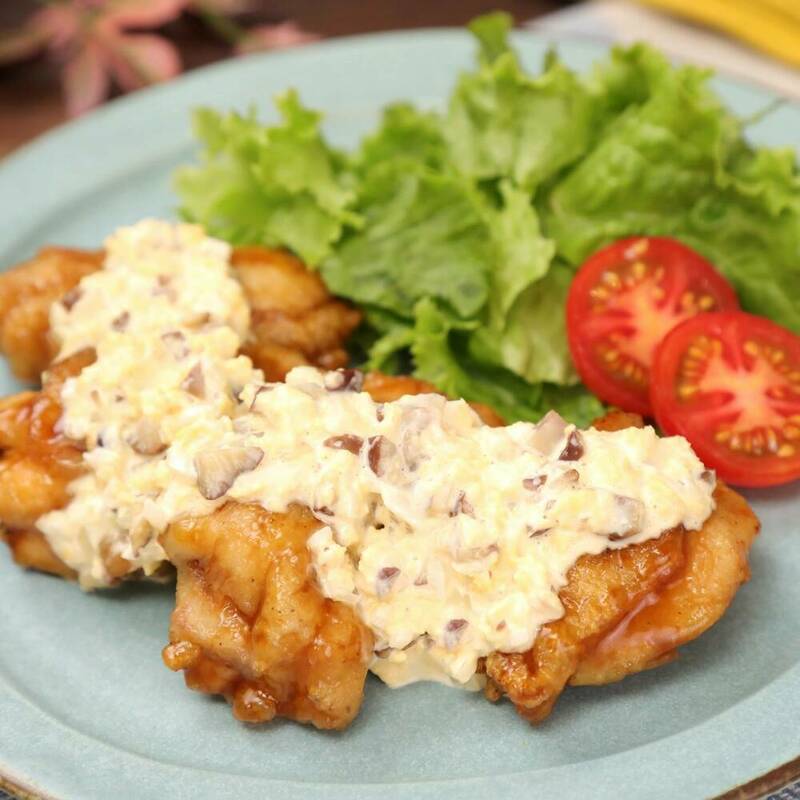 【甘栗タルタル】をかけ、お好みでサニーレタスとミニトマトを添える。