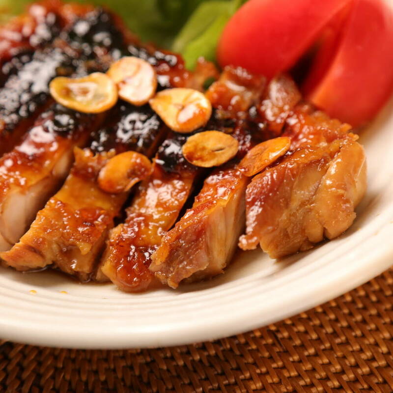 1/3程度に煮詰まってとろりとしたら、鶏肉を食べやすい大きさにきって器に盛り付ける。