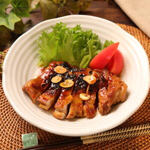 残ってる煮汁を鶏肉にかけ、取り出しておいたにんにくを散らす。