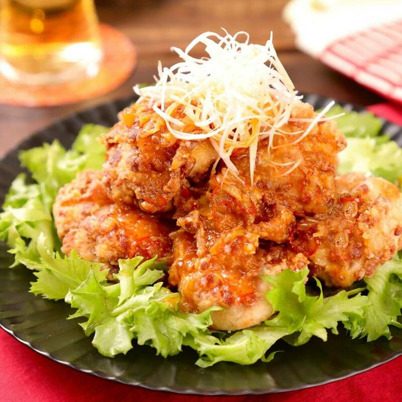 器にレタスをひき唐揚げ、白髪ねぎを盛りつけ麻辣ソースをまわしかける。