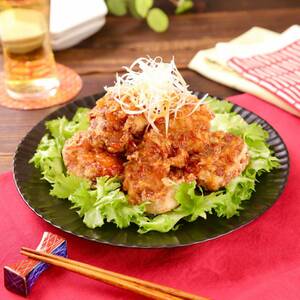 バットに片栗粉と薄力粉を混ぜ合わせ、漬けておいた鶏肉を入れる。全面になじませ、5分程置く。