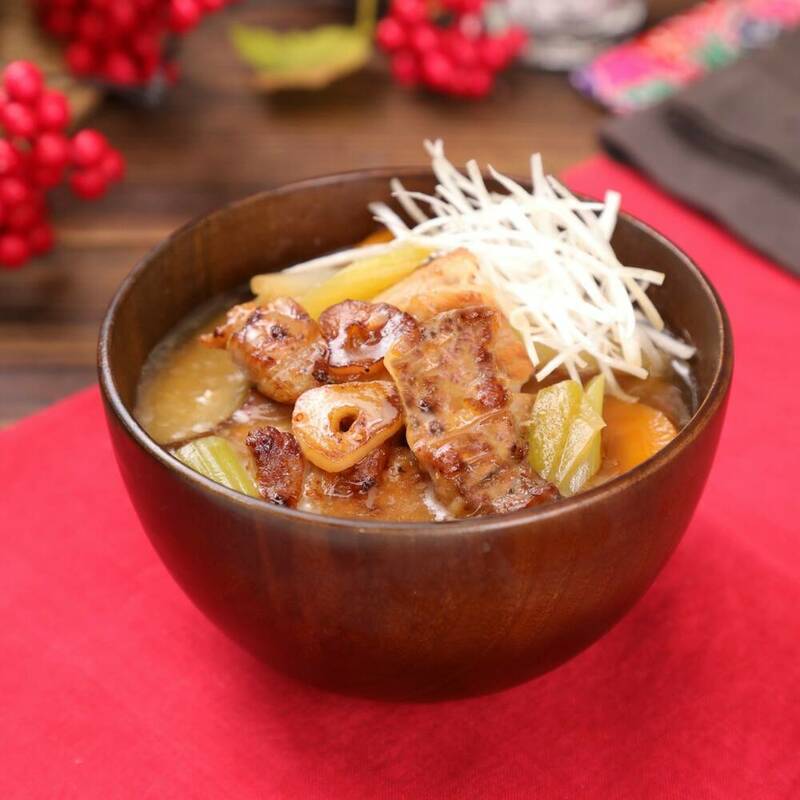 大根、人参にも焼き色がついたら長ねぎ、水を入れて沸騰させる。火を弱めて味噌の半量を溶かし入れて4~5分程煮込む。