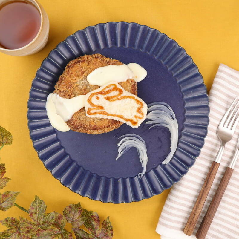 お好みソースをディスペンサーか絞り袋に入れ、サンドイッチ用食パンに、うさぎのイラストを描く。