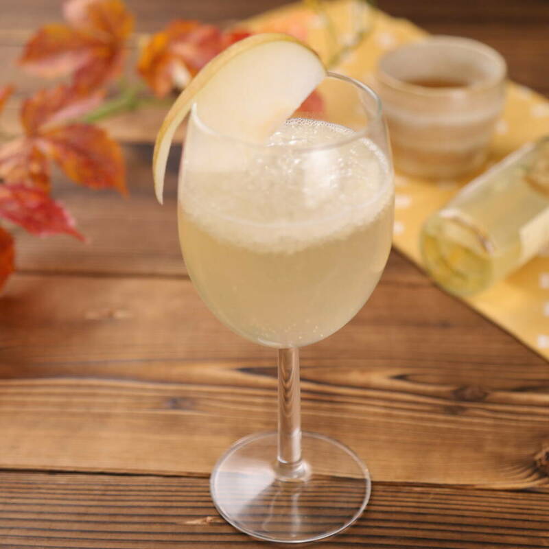 グラスに白ワイン、ほうじ茶、すりおろした梨を入れ混ぜる。