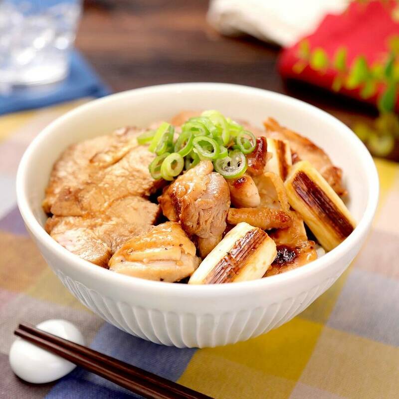 器にご飯をもりつけお好みで<10>のたれをかけ、刻みのりをひく。器の半分に<10>を盛りつけ、お好みでたれをかける。