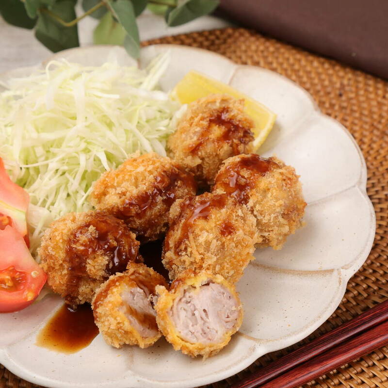 豚こま切れ肉を1枚ずつ広げる。塩、粗びき黒こしょうで下味をつけ、手前から巻きながら丸く成形する。
