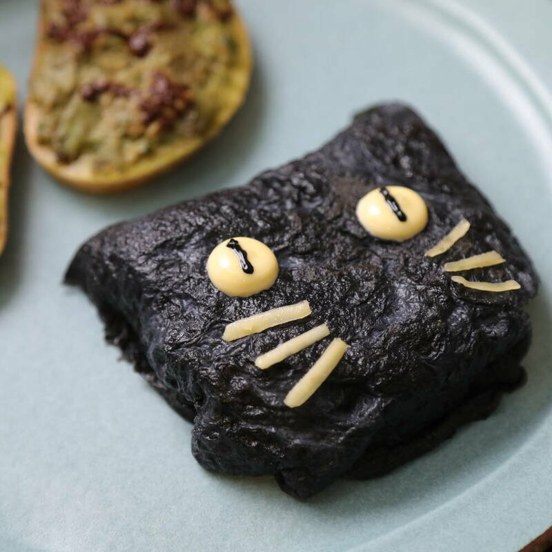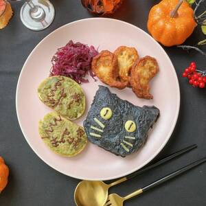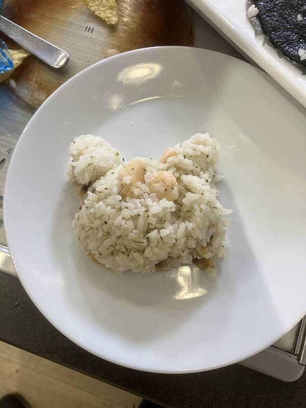 ピラフに乗せ形を整形する。マヨネーズで目を丸く絞り、黒マヨネーズで黒目を書く。チーズでひげを作る。