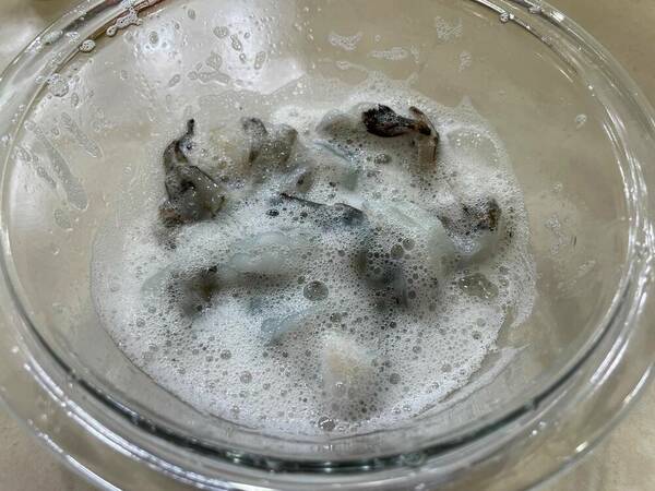片栗粉小さじ1(分量外)と水でもみ洗う。流水で流し、キッチンペーパーで水分をふきとる。