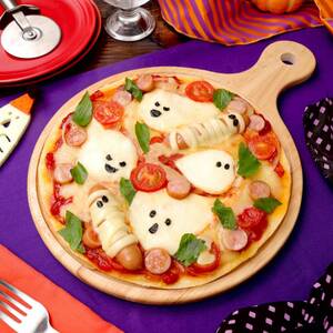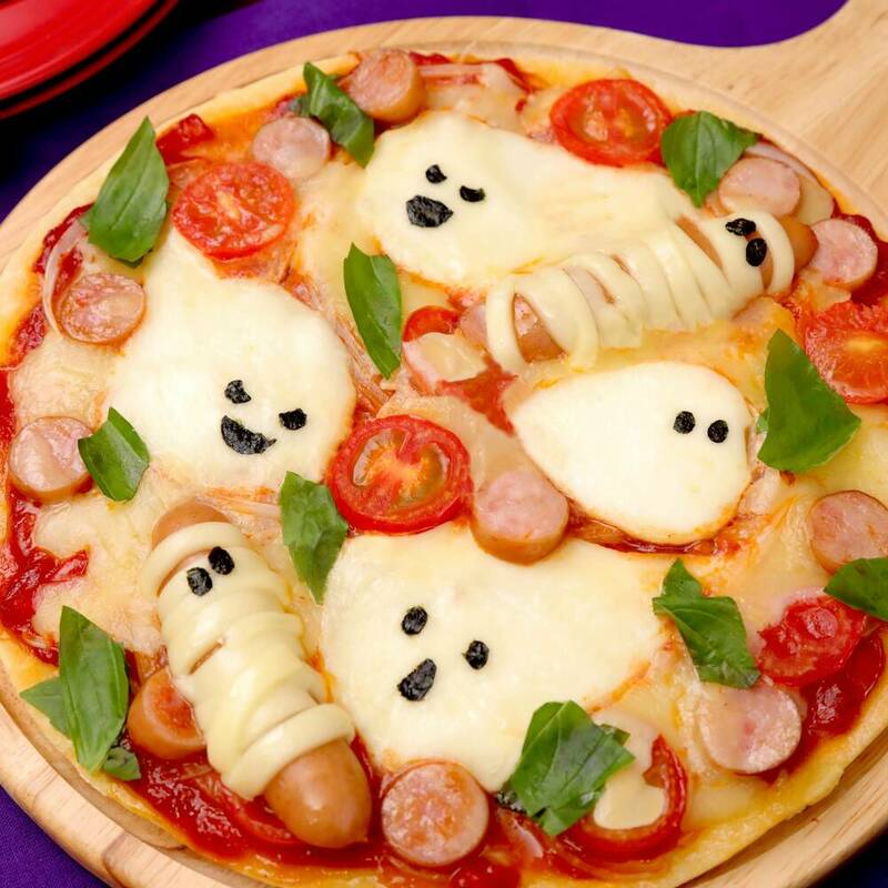 モッツァレラチーズを箸などでおばけの形にする。<7>も盛りつけ海苔で顔をつくり、バジルを手でちぎりのせる。