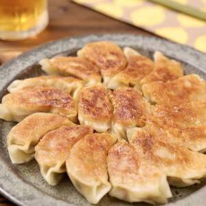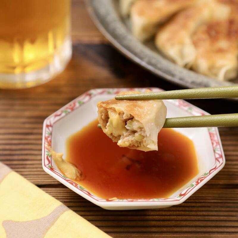 フライパンに器をかぶせ、上下を返して器に餃子をのせる。【たれ】の酢としょうゆを混ぜ、お好みで練り辛子をつけていただく。