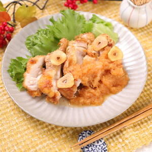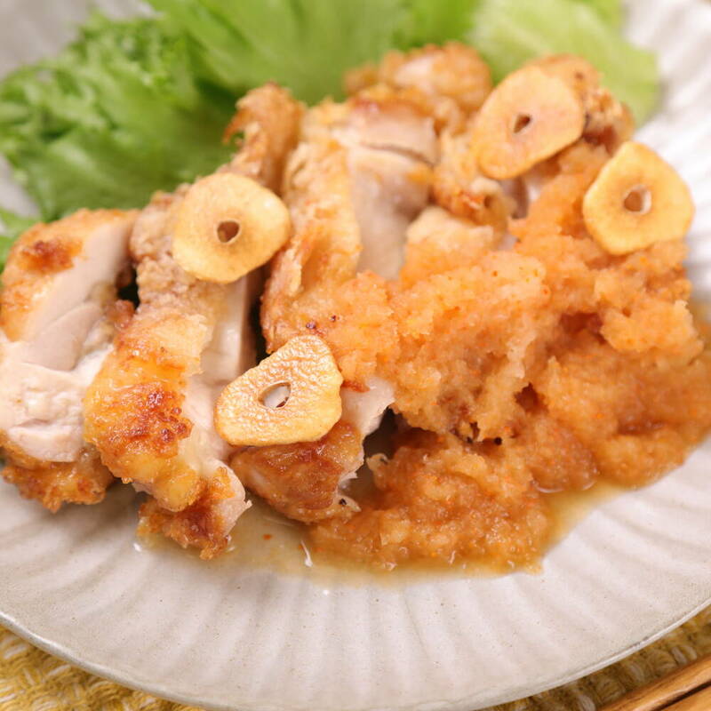 鶏もも肉に片栗粉をまぶす。にんにくを揚げた油(170℃〜180℃)で5〜6分程度揚げて、油を切る。