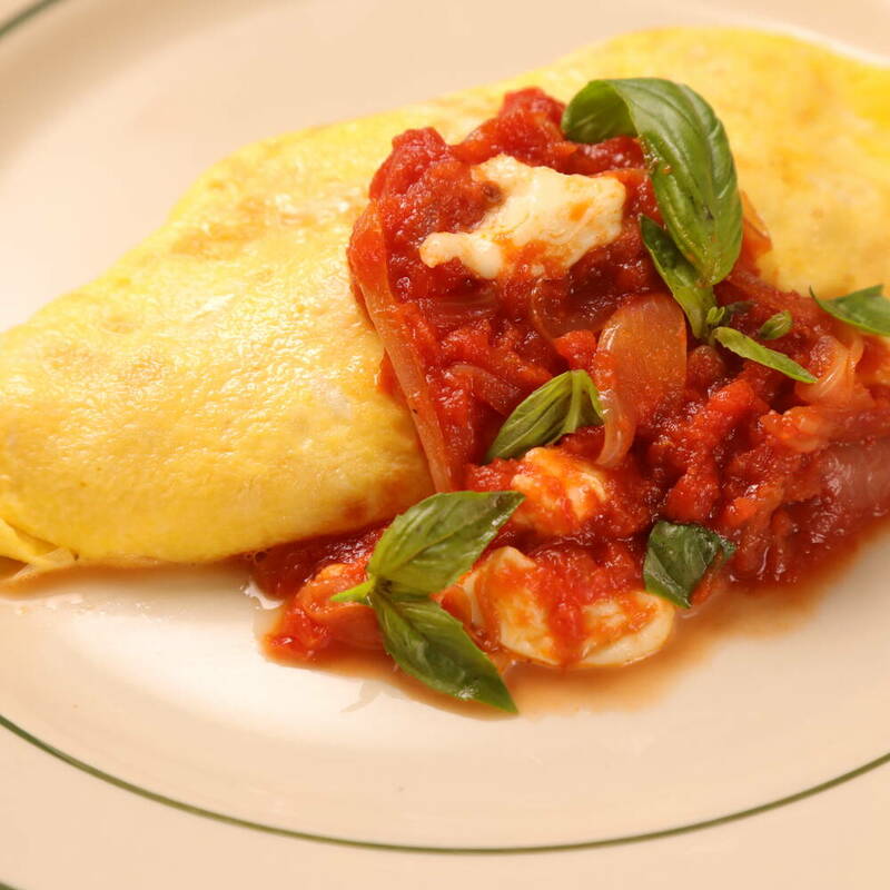 <3>を温め直し、ちぎったバジルとチーズを加え予熱で溶かす。オムライスにかけて飾りのバジルを添える。