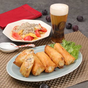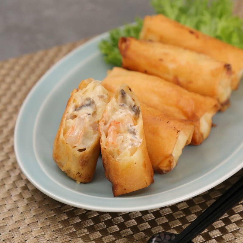 水溶き薄力粉を作り、春巻きの皮に<5>をのせ、端から巻き、巻き終わりに水溶き薄力粉を塗る。